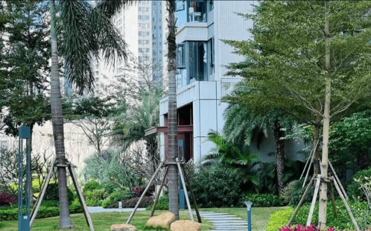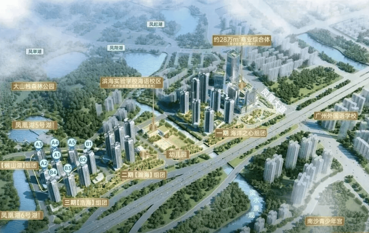 项目北倚大山乸森林公园(占地946万㎡,南沙第二高峰),南临凤凰湖景区(规划7个湖区,其中凤林湖、凤采湖紧贴项目)。小区内部由国际知名景观设计公司贝尔高林操刀,打造“海洋之心”主题园林,包含中央水景、500米环形跑道、阳光草坪、亲子乐园等多元功能空间。