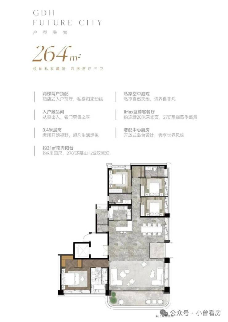 项目打造了两大产品序列,分别为桂府壹号 Ⅰ 系建面约 140-264㎡现代美学大宅,以及建面约 129-148㎡都芯轻奢私邸,全面覆盖改善型人居与高端资产配置的多元化需求。其中,桂府壹号 Ⅰ 系作为白云新城 CBD 近五年来首发的塔尖人居作品,从登场之初便注定成为广州高端人居市场的封藏级作品,以 CBD 中轴之上的稀缺占位、极致的产品设计、高奢的品质呈现,重定广州塔尖人居的全新标准,为立于世界台前的广州壹号人物,打造专属的人居封面。
