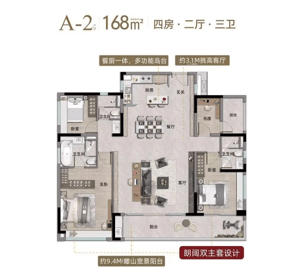 项目主力户型为建面约 97-117-137-142-168㎡的三至四房,得房率达 88%-98%,空间利用率高,且所有户型均具备鲜明亮点。其中,97㎡3+1 房 2 卫三开间朝东南,带约 6.1 米大阳台,可享梅花岭一线山景;118㎡四房实现南北对流,四开间通透,约 6.7 米阳台兼顾山景与园景;168㎡双主套四房更是配备约 9.2 米超宽阳台、6.1 米阔绰客厅,为板块内稀缺户型。