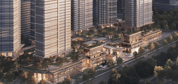 打造全市首创11米挑高空中浮岛园林,参考新加坡樟宜机场理念,融合热带雨林景观、半开放中庭水院与观景平台;