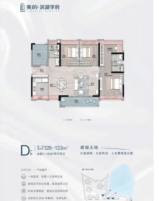 143-147㎡的头排一线湖景户型,270°观景面,南北双阳台,空间尺度感拉满,总价约240万起,定位改善客群。这个户型不仅空间大,而且景观极佳,是项目的高端产品线。
