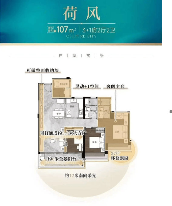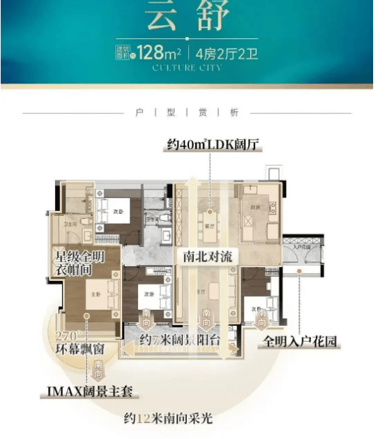 具体来看,建面约107㎡的四房,拥有12米南向采光面,采用通透LDK一体化设计,搭配约6米奢阔阳台,同时带有独立入户花园,提升了空间的实用性与尊崇感。建面约128㎡的四房,做到约16米南向采光、南北对流,配备约40㎡LDK阔厅,空间尺度远超市场同面积产品,能够满足家庭日常活动与社交需求。