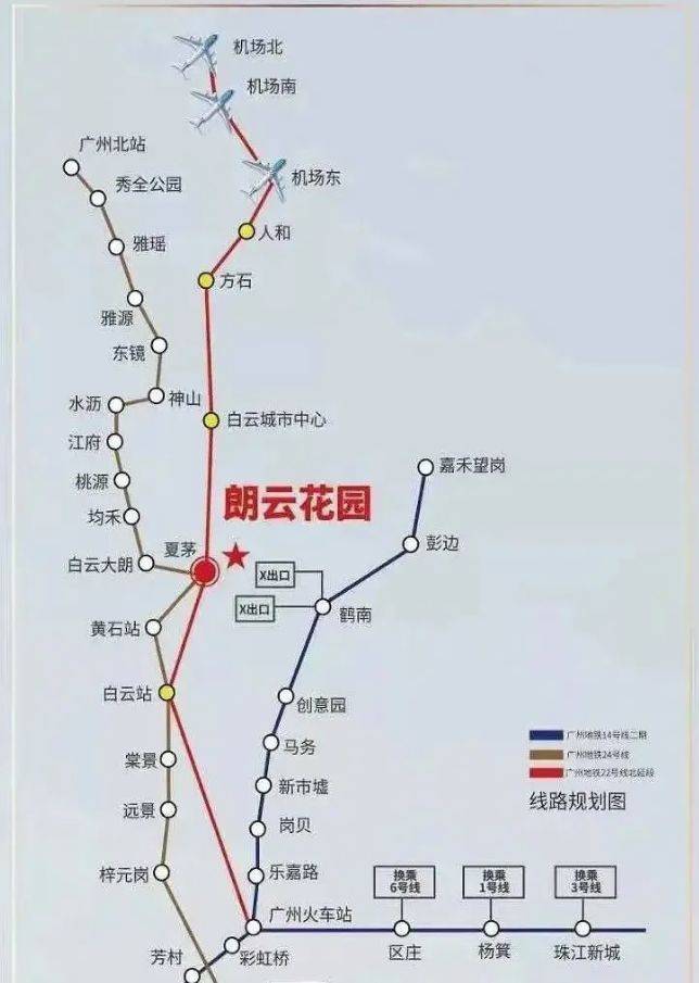 合景朗云花园交通便捷程度在同区域楼盘中脱颖而出。在建的夏茅地铁站作为白云未来交通枢纽之一,三条地铁线路在此交汇,无疑为居民出行编织了一张高效便捷的交通网。8 号线北延段和 22 号线北延段已经在建,即将动工的 24 号线更让交通便利性锦上添花。约 100 米处 22/8 号线北延段支线双线交汇,居民乘坐 22 号线,1 站就能抵达白云新城站,2 站到越秀,3 站至荔湾,换乘 18 号线后,5 站直达珠江新城(冼村),大大缩短了与城市核心区域的时空距离。8 号线北延段支线则可迅速抵达越秀、花都,串联起广州北站和白云棠溪 TOD,无论是商务出行还是休闲旅游,都能快速抵达目的地。交通路网四通八达,距离白云新城约 3.5 公里,广州火车站 9 公里,珠江新城 18 公里,到广州白云机场仅 20 公里,30 分钟车程畅行广州各大重要区域。