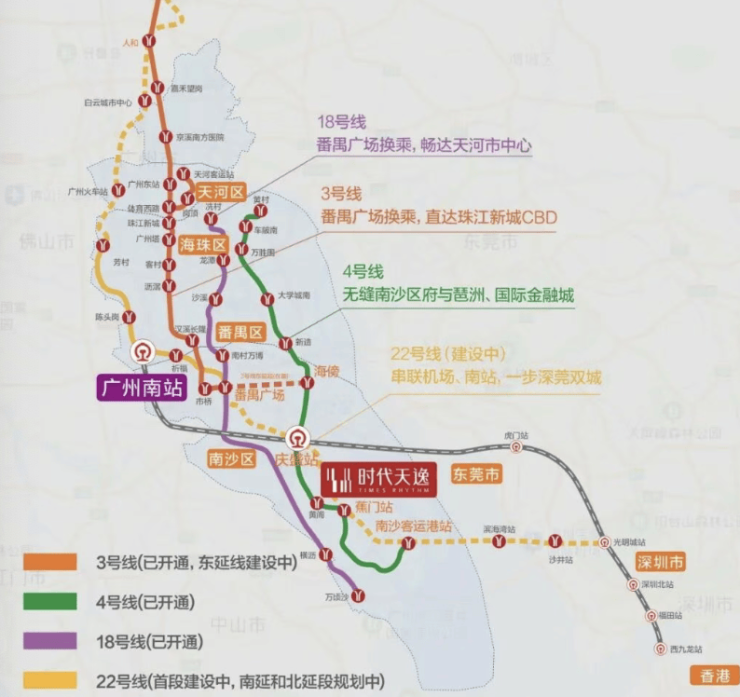 地铁 22 号线(规划):设计时速 160km/h 的湾区城际快线,未来将串联广州南站、南沙、东莞滨海湾、深圳光明科学城,实现 30 分钟广深同城。