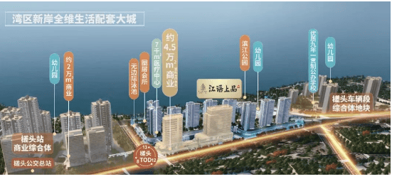 江语上品苑所在的槎头 TOD 项目总建面超 150 万方,分三期进行连片统一开发,未来将形成一个集居住、教育、商业、轨道等自成一体的超能生活大城。作为槎头 TOD 二期项目,江语上品苑自身配建约 4.5 万商业,其中包含约 37000㎡集中式商业和约 7000㎡风情临街商业,集中式商业将引入各类品牌商家,涵盖购物、餐饮、娱乐、休闲等多种业态,满足业主的日常消费需求;风情临街商业则能为业主提供更加便捷的社区服务,如便利店、水果店、药店等。此外,槎头 TOD 一期、三期合计规划约 4 万㎡商业,整个 TOD 项目将拥有 8 万㎡高端商业,规划大型高端商服配套,未来这里将成为区域内的商业核心之一。同时,项目 5 公里范围内还有凯德广场、百信广场、白云天河城、5 号停机坪广场等成熟商圈环伺,业主可轻松享受更丰富、更多元的商业体验。