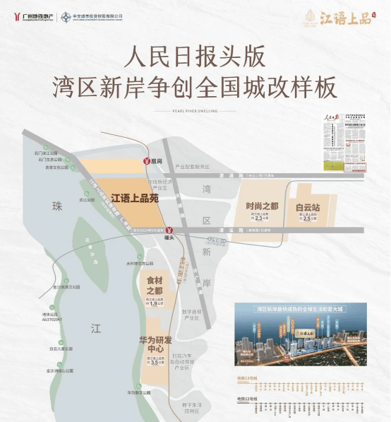 江语上品苑所在的湾区新岸(罗冲围)片区,是白云区乃至广州市未来社会经济发展的高热点区域,官方甚至宣传这里将打造成为 “第二个珠江新城”。随着白云二线、棠槎路等路网的打通,项目所在片区可与白云站 TOD、白云新城实现连片发展,区域价值将不断提升。更值得关注的是,华为百亿智能汽车产业及 5000 人中国研发基地已落地,距离项目仅 3km。湾区新岸的产业发展规划以华为为核心,打造一带三产,即华为智能中心技术带、智能汽车产业融合发展区交汇、在线新经济产业园、数字商贸区,目前华为研发中心已投入使用,未来将成为华为全国科研人员的唯一研究中心,5000 高新人才即将进驻,通过一带三产还将吸引更多上下游的高新客户人才聚居。待产业落地后,湾区新岸将实现约 600 亿生产总值,预计占据白云区全区 30% 的经济总量。产业的集聚将带来人口的流入和消费的增长,进一步推动区域的发展,也为江语上品苑带来了巨大的升值潜力。