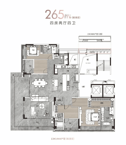 江语上品苑在户型设计上充分考虑了业主的居住需求和舒适度,主打约 125-142㎡四房两厅两卫以及 214-313㎡大平层户型,全盘皆为独栋的 2 梯 4 户 + 2 梯 2 户多层洋房产品,并将总户数限制在 1000 之内,提升了业主对公区的享有率。所有房源均做到 270° 南向环幕瞰江设计,拥有大面宽、入户花园与南向跑道式阳台,让业主能最大限度地欣赏江景,享受阳光与清风。