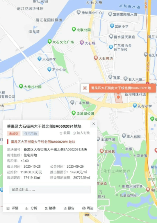 2024年10月28日,越秀地产以总价11.94亿元、溢价率8.15%成功竞得番禺大石街南大干线北侧BA0602091地块,扣除配建后楼面价约16572元/平方米。这一价格显著低于板块内近年成交的龙湖御湖境(24082元/㎡)与保利滨江和著(22574元/㎡),为产品定价预留充足空间。更关键的是,该地块容积率仅2.6,是当前广州稀缺的低密度住宅用地,且距离地铁3号线大石站仅约450米,叠加在建18号线与东环城际铁路,交通能级跃升。越秀地产迅速明确产品方向——打造片区罕见的2T2板楼,并引入“酒店式会所”,直指改善型客群。在新房供应有限的大石板块,这一项目无疑将成为激活区域价值的关键变量。