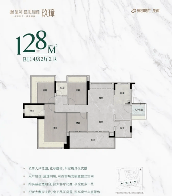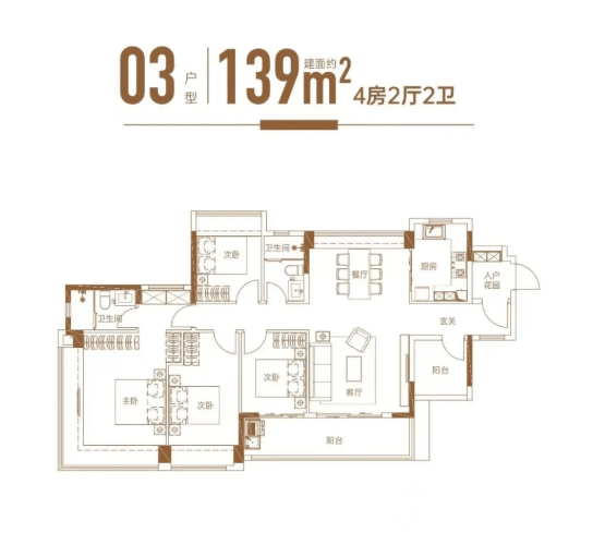 128㎡户型:独立入户花园设计,增加了鞋柜的置物面积,厨房、客餐厅和主卧尺度大幅提升,带来宽敞明亮的居住环境。