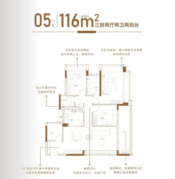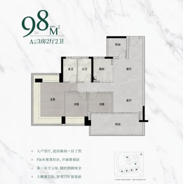 98㎡户型:主朝向朝南,阳光充足,配备270°无柱飘窗,视野开阔。次卧和阳台尺度大幅增加,提供更舒适的居住体验。
