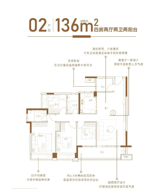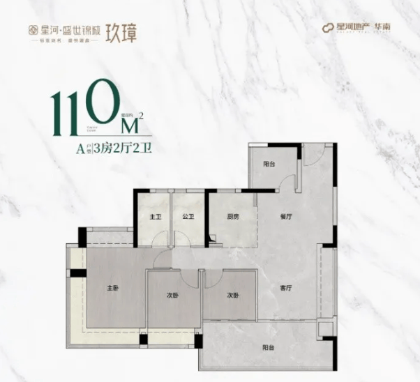 110㎡户型:主朝向西南,客厅、阳台和主卧尺度全面超越二期,空间更加宽敞大气,彰显尊贵风范。