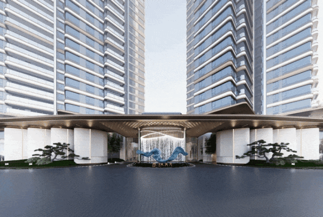 目之所及,是超长的门楼界面、普拉达绿色奢石、艺术雕塑.......绿树与涌泉景墙掩映,仿佛来到五星级度假酒店。