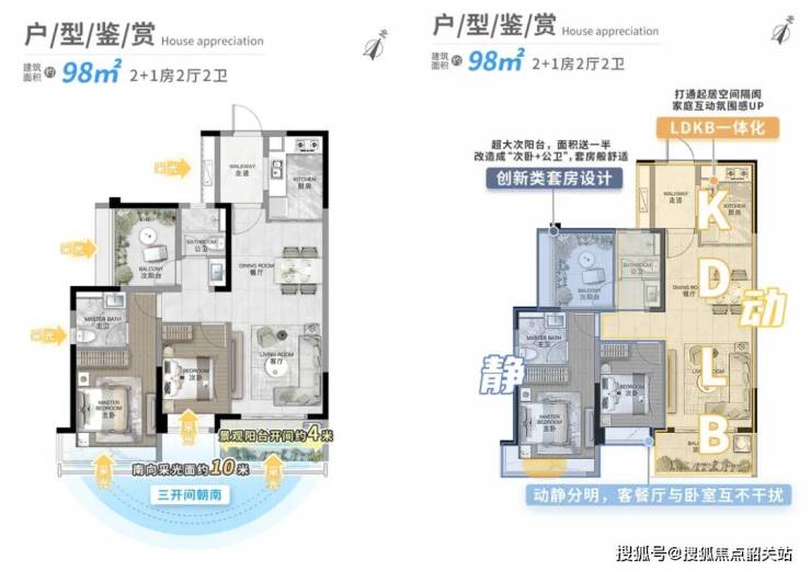 所有户型均采用全南向设计,结合LDKB一体化公区、270°转角飘窗、双阳台对流等创新设计,实现“小而不挤,大而不空”: