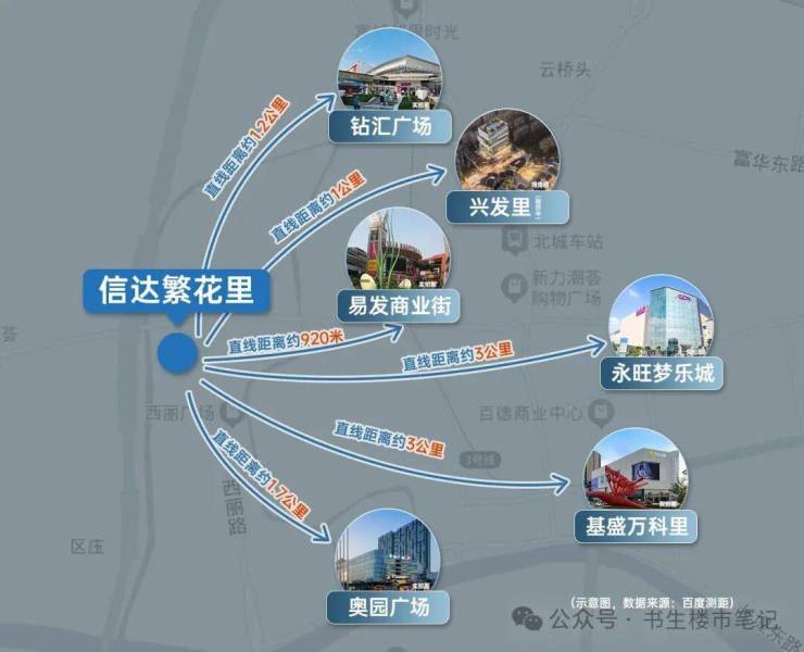✅ 商业覆盖:3km内三大成熟商圈,涵盖易发商业街、钻汇广场、永旺梦乐城等核心商业体;