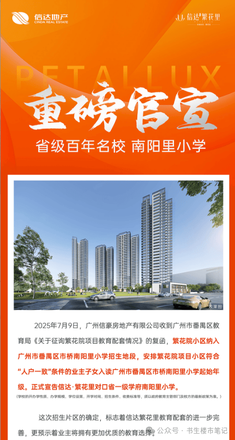 3. 教育对口官方官宣:根据番禺区教育局2026年4月最新发布的《番禺区义务教育阶段学校招生地段调整方案(征求意见稿)》,信达·繁花里已明确纳入省一级南阳里小学招生范围,官方已完成官宣公示,教育对口具有高度确定性(最终学区划分以交付当年教育局正式文件为准,项目作为新建住宅,享有就近入学优先权)。同时,项目3km内13所优质学校的分布信息,均来自番禺区教育局官方备案名单,真实可查。