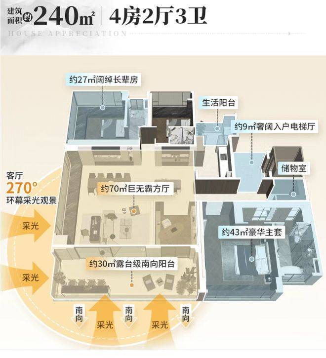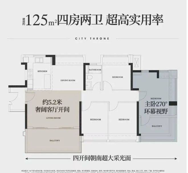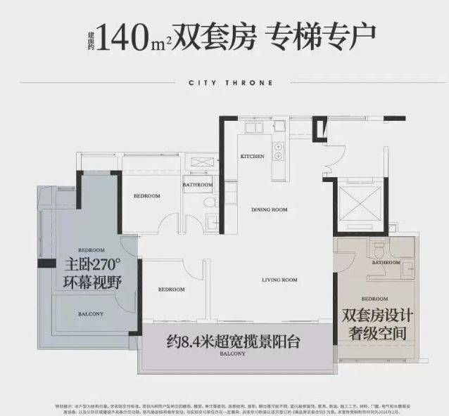户型设计高端且独特。主推 129㎡、143㎡、190㎡、240㎡南向四房起户型,板式住宅(143 方起)两梯两户。楼王 T5 栋独栋板楼,户户约 240 平千万级大平层,专梯专户,南北纯板式,单边位置,户户三面赏景。T7 栋央景楼王主打约 140 平户型,景观绝佳,望浮岛森谷与白云山,270° 飘窗搭配约 8.4 米南向巨幕阳台,双南向套房设计,四开间朝南。户型实用率 100% - 110%,空间利用合理,满足高端改善需求。