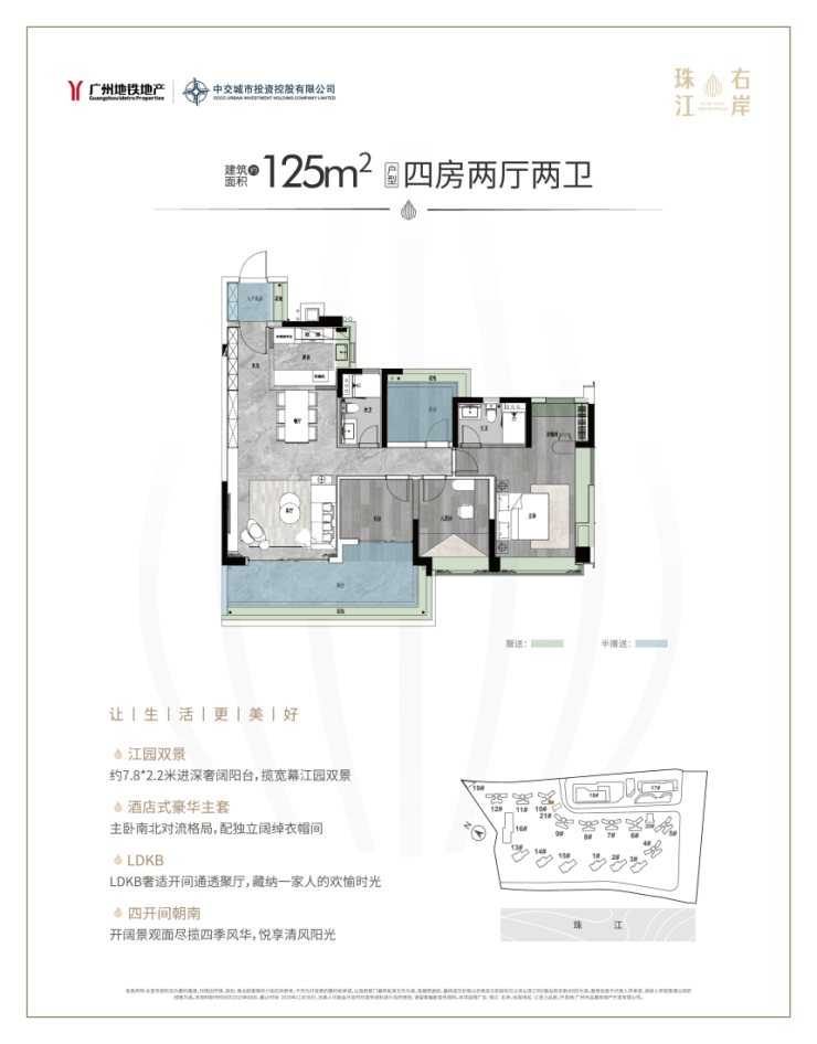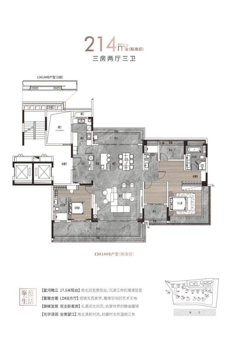214㎡大平层:2梯2户设计,独立电梯厅,15米南向展宽,7.8米江景阳台。
