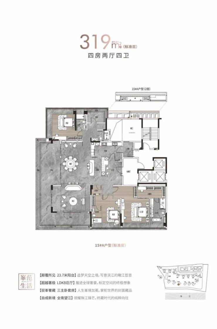 319㎡大平层:一梯一户配置,10米开间环幕客厅,270°转角玻璃窗,50㎡主卧套房。