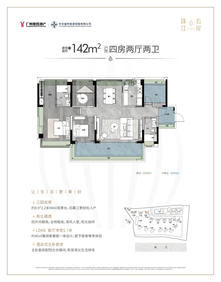 142㎡四房:双主套设计,LDK一体化布局,9米宽景阳台,适合多代同堂。