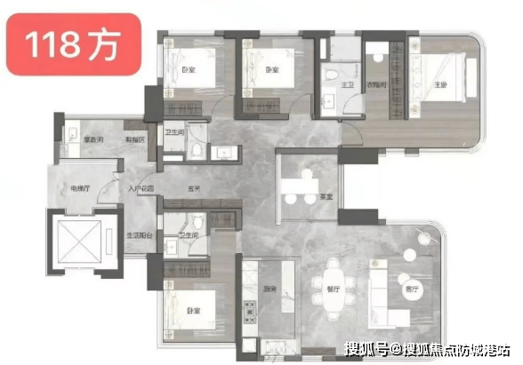 首推5栋(46层)、6栋(32层),户型面积涵盖108-141㎡五房,采用“零飘窗+阳台扩展”创新设计,实现150%得房率,远超市场同类产品。以141㎡户型为例: