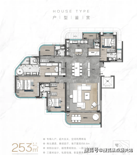 🔹253㎡一线滨江大平层(顶改户型):作为项目的标杆户型,该户型距江仅100米,270°环幕全景落地窗,江景视野无遮挡。LDK餐客厅一体化设计,客厅开间达6.8米,搭配超12米的观景阳台,空间奢华大气。厨房配备独立岛台,主卧面积超35㎡,带豪华卫浴套间与双衣帽间,尽显高端品质。适合预算2000-2500万的高端改善客群,追求极致滨江居住体验。