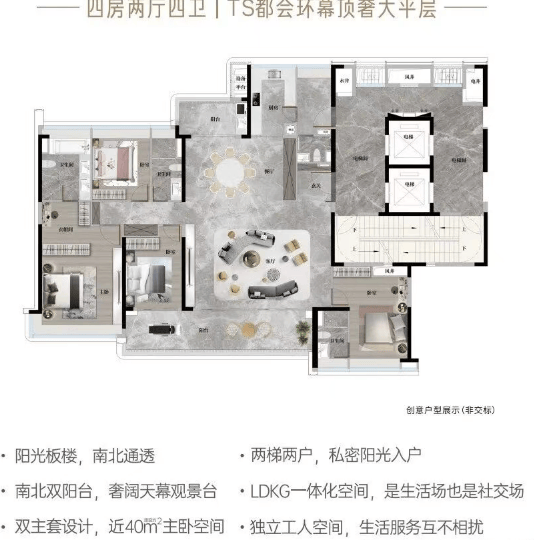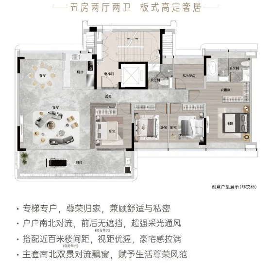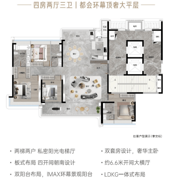 特点:限量级低密板式高层,双阳台设计,近9米宽巨幕阳台,总统级主卧奢套。