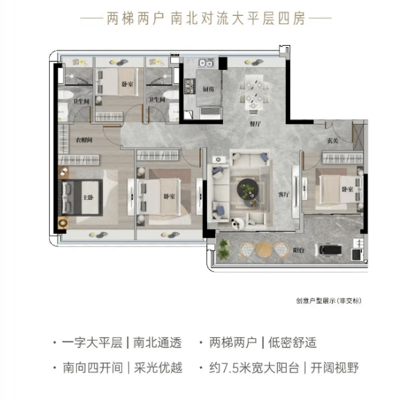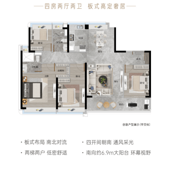 特点:限量级低密板式高层,约10.3米宽巨幕阳台,双主卧套房,让孩子多一度独立空间。