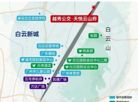 越秀·天悦云山府位于白云新城北部片区,紧邻白云大道,背靠白云山生态屏障。项目与白云山直线距离仅约120米,属于非常少见的“贴山而居”型住宅。