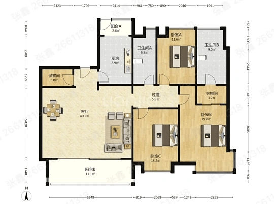卧室:四大卧室独立分布,主卧空间阔绰,可打造独立衣帽间与休憩区,兼顾私密性与舒适度,次卧可根据家庭需求打造为儿童房、老人房、书房等,灵活适配不同家庭结构的居住需求;
