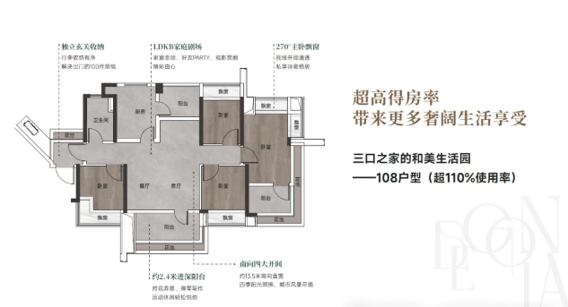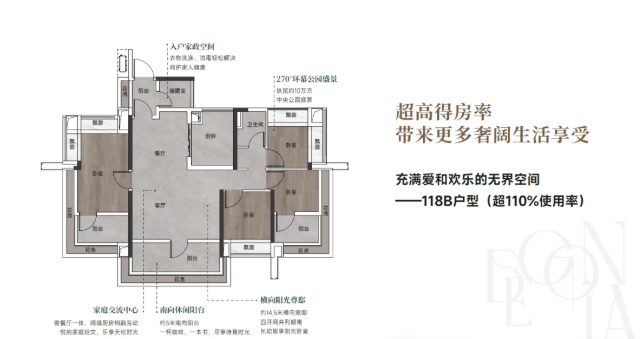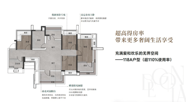 高使用率:户型设计灵活,空间利用率高,阳台占比大,增加了居住舒适度。