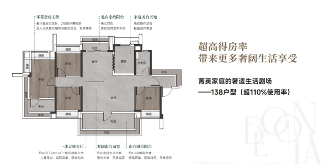 项目主要推出108㎡、118㎡、138㎡的三至四房户型,以及四套顶复200㎡户型。这些户型设计灵活,阳台占比高达20%,实际使用率可达110%-130%,为业主提供了宽敞舒适的居住空间。